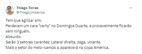 Segundo a publicação do O Dia, Marcos Braz já tem tudo encaminhado com Domingos Duarte e se não fechar com o capitão do Bragantino deve se adiantar para avançar com o português. O acordo seria de 3 milhões de euros (R$ 16 milhões) ao Getafe, da Espanha.