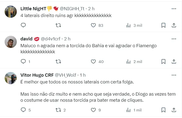 Mas, de acordo com o jornalista Diogo Dantas, outro nome ganhou força nos bastidores Rubro-Negro para o próximo ano. Trata-se de Gilberto, atualmente no Bahia. Aos 26 anos, o jogador tem vínculo com o clube até junho de 2026.