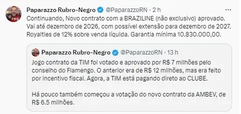 Para fechar os valores de R$ 24,3 milhões, o terceiro vínculo selado foi com a Braziline, que desses será o que vai gerar a maior quantia ao Flamengo. “Continuando, novo contrato com a BRAZILINE (não exclusivo) aprovado. Vai até dezembro de 2026, com possível extensão para dezembro de 2027. Royalties de 12% sobre venda líquida. Garantia mínima 10.830.000,00”.
