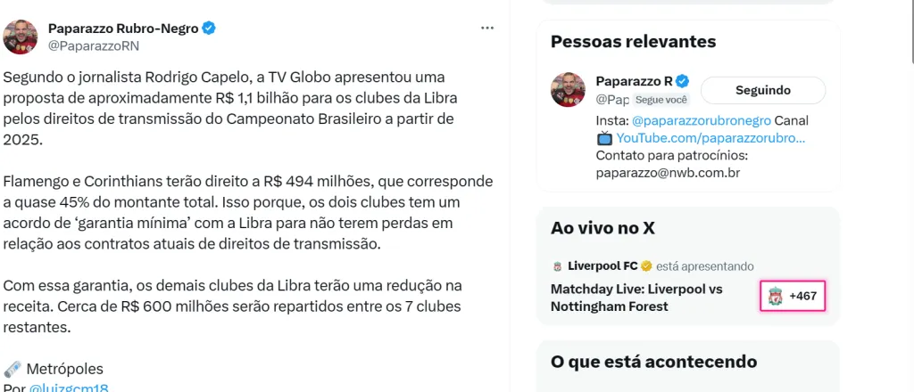 A proposta da TV Globo pelos direitos de transmissão do Campeonato Brasileiros aos clubes do grupo da Libra chega a incríveis R$ 1,1 bilhão. O Bolavip Brasil já noticiou tal projeto da emissora a partir de 2025 na última semana.