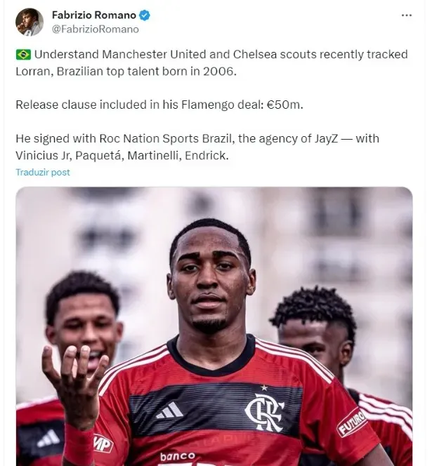 “Os olheiros do Manchester United e do Chelsea rastrearam recentemente Lorran, grande talento brasileiro nascido em 2006. Cláusula de rescisão incluída no contrato com o Flamengo: € 50m. Assinou com a Roc Nation Sports Brasil, agência do JayZ — com Vinicius Jr, Paquetá, Martinelli, Endrick”, afirmou o jornalista em sua conta no X (antigo Twitter).