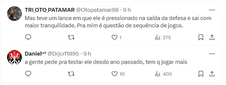 “Fez um grande jogo. Reeditou o que fez no treinamento. Quem ganha é o Flamengo. Temos bom problema ali no setor. Para um ano de calendário apertado, sempre bom ter reposição. Como o Tite diz, uma busca leal pelo espaço”, concluiu.