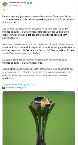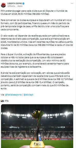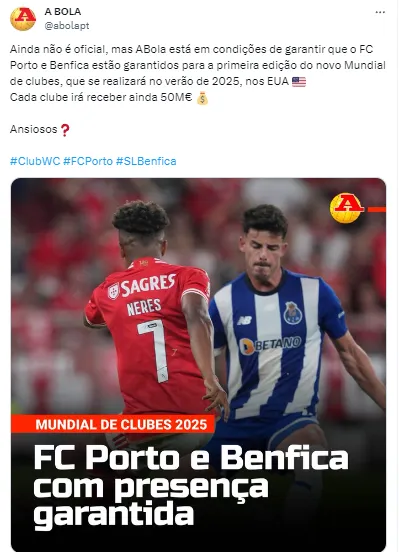 “Ainda não é oficial, mas ABola está em condições de garantir que o FC Porto e Benfica estão garantidos para a primeira edição do novo Mundial de clubes, que se realizará no verão de 2025, nos EUA. Cada clube irá receber ainda 50 milhões de euros (R$ 270 milhões)”, publicou o perfil do site nas redes sociais.
