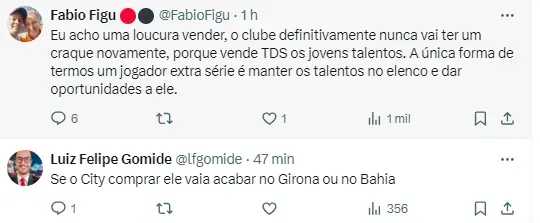 Porém, a informação é que o staff do atleta tem medo que ocorra uma situação. Caso ele seja vendido, há o temor que ele seja emprestado para outro time do Grupo City, o que não seria interessante para sua carreira.