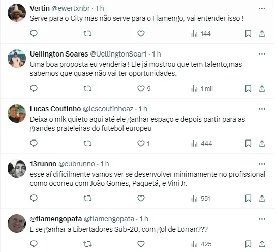 De acordo com o portal Mundo Rubro-Negro, o poderoso Manchester City está de olho no jovem meia-atacante Lorran, de apenas 17 anos. Caso aconteça a negociação, o Mais Querido pode levar uma verdadeira fortuna com sua venda.