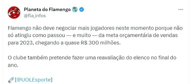De acordo com informações do UOL Esporte, o Flamengo não deve negociar mais jogadores neste momento porque não só atingiu como passou — e muito — da meta orçamentária de vendas para 2023, chegando a quase R$ 300 milhões.