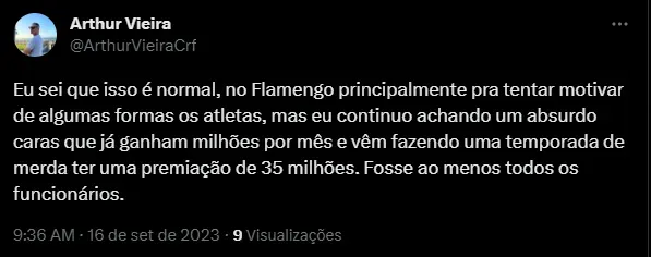 Em caso de vice-campeonato, o Flamengo receberá da CBF R$ 30 milhões e pagará aos jogadores o valor de R$ 9 milhões, o que dá 30% para o famoso ‘bicho’. Essa já é uma prática recorrente da diretoria flamenguista, que realizou essa mesma ação tanto na Libertadores quanto na Copa do Brasil de 2022, títulos que ficaram na galeria de troféus do Rubro-Negro.