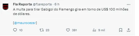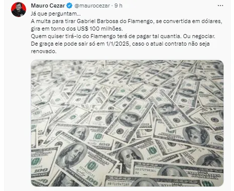A informação do jornalista é que a multa do atacante do Fla é de aproximadamente R$ 490 milhões. “Já que perguntam… A multa para tirar Gabriel Barbosa do Flamengo, se convertida em dólares, gira em torno dos US$ 100 milhões”.