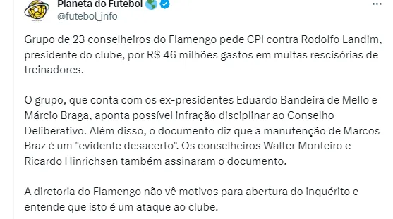 Isso porque de acordo com o UOL Esporte, cerca de 23 conselheiros e associados do Clube Carioca, inclusive os ex-presidentes Eduardo Bandeira de Mello e Márcio Braga, assinaram um requerimento neste sábado (6) em que é pedida a abertura de uma CPI contra Landim. Segundo o documento, foi cometido uma “infração disciplinar” por conta dos altos valores pagos em multas rescisórias para treinadores.