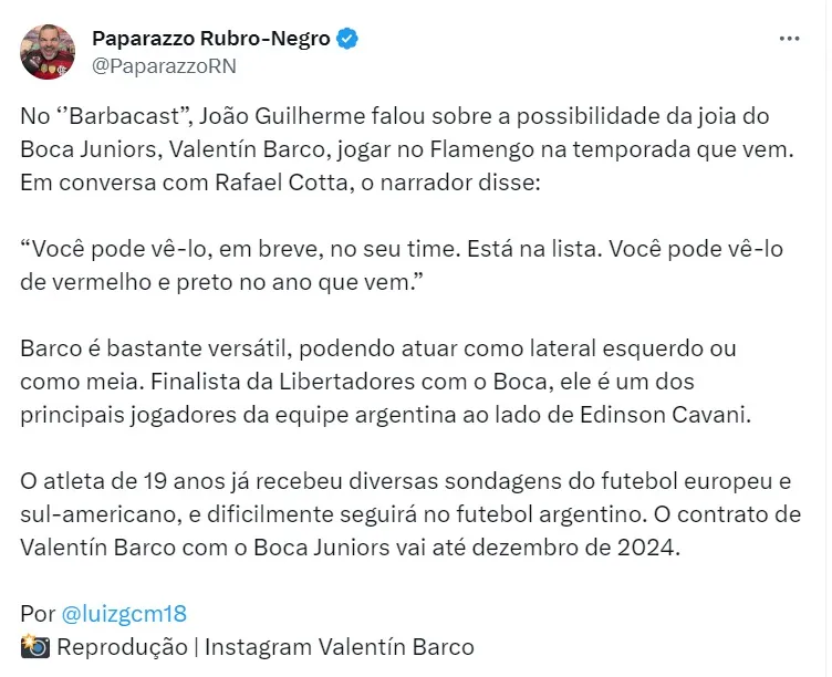 O Flamengo vem monitorando o mercado e já tem alvos definidos. Apesar de adotar cautela, a gestão vem acompanhando de perto analisando o mercado. E o nome de Valentín Barco, do Boca Juniors, chamou a atenção dos Rubro-Negros.