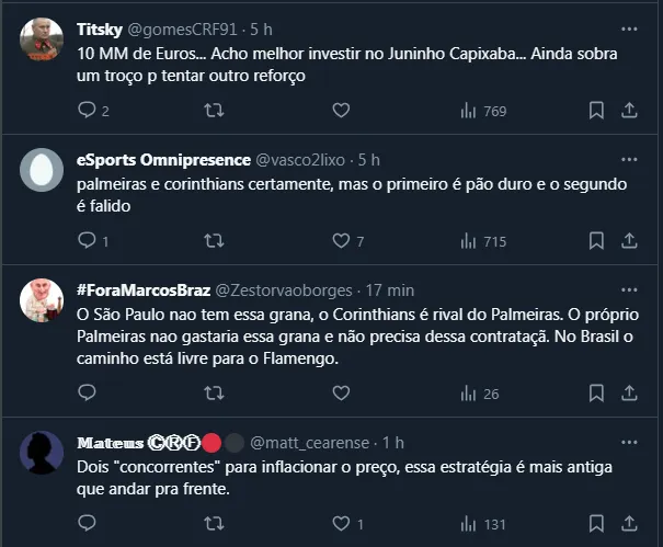 No entanto, vale a pena frisar que Marcos Braz e Rodolfo Landim devem continuar negociando para tentar abaixar o valor. Internamente, o Fla trabalha com otimismo, mesmo com a concorrência de Palmeiras e Corinthians.