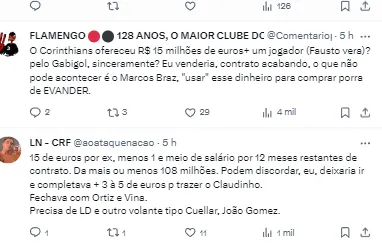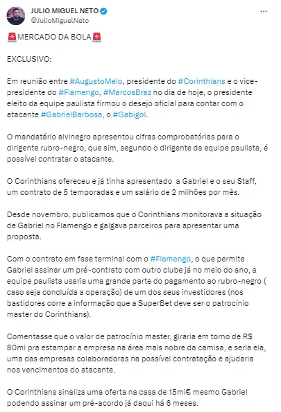 “O Corinthians sinaliza uma oferta na casa de 15 milhões de euros mesmo Gabriel podendo assinar um pré-acordo já daqui há 6 meses”, informou Julio em postagem nas suas redes sociais sobre o que o Timão está disposto a pagar para contar com o atacante já em 2024.