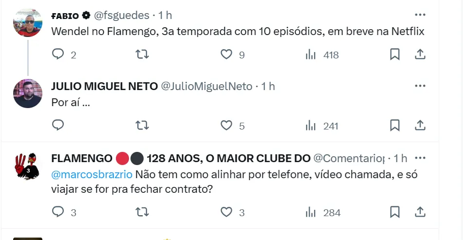 Chateado na ocasião, Wendel avisou que na próxima janela de transferências chegará ao clube. “Chegamos perto, na próxima eu vou para o Flamengo”, relatou o meio-campista, que já deixou claro que quer jogar no Mengão.