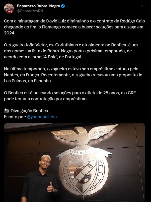 A direção flamenguista analisa o seu primeiro reforço para 2024. O nome que agrada o alto escalão é o zagueiro João Victor, do Benfica. O atleta de 25 anos jogou no Corinthians no futebol brasileiro e vê com bons olhos uma volta ao país, tendo em vista que não conseguiu se firmar no clube português.