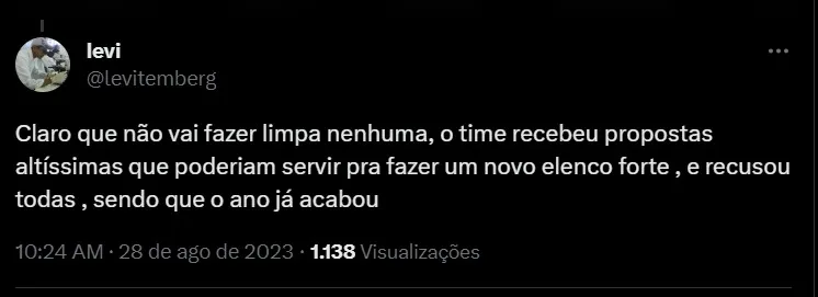“A tendência é a não permanência de Sampaoli para o ano de 2024, isso é bem claro, e essa limpa dificilmente vai ser feita porque os dirigentes parecem que têm medo dos jogadores. Um respeito excessivo pelos jogadores que claramente não têm fome de título e claramente demonstram que, para eles, é ‘já ganhei’. O Flamengo faz uma temporada ridícula e não há nenhuma perspectiva de melhora, pelo menos até o final do mandato de Landim, que vai até o final de 2024”.