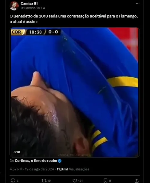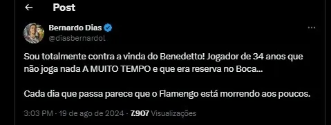 “Sou totalmente contra a vinda do Benedetto! Jogador de 34 anos que não joga nada A MUITO TEMPO e que era reserva no Boca…Cada dia que passa parece que o Flamengo está morrendo aos poucos” reclamou em sua rede social.
