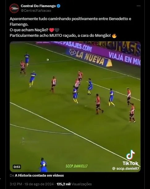 Aparentemente, tudo caminhando positivamente entre Benedetto e Flamengo. O que acham Nação? ❤️🖤️Particularmente acho MUITO raçudo, a cara do Mengão,” disse a conta no X.