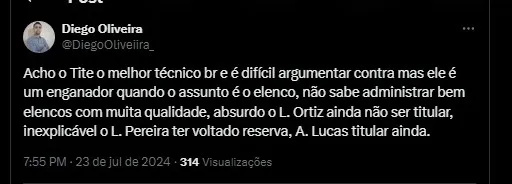 Acho o Tite o melhor técnico br e é difícil argumentar contra mas ele é um enganador quando o assunto é o elenco, não sabe administrar bem elencos com muita qualidade, absurdo o L. Ortiz ainda não foi titular, inexplicavelmente o L. Pereira voltou à reserva, A. Lucas titular ainda.