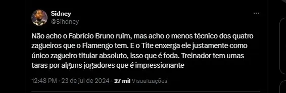 Não acho o Fabrício Bruno ruim, mas acho o menos técnico dos quatro zagueiros que o Flamengo tem. E o Tite enxerga ele justamente como único zagueiro titular absoluto, isso que é foda. Treinador tem umas taras por alguns jogadores que é impressionante.