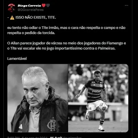 Após Tite divulgar a escalação a torcida do Flamengo ficou revoltada com o técnico Tite. A insatisfação foi tão grande que o nome Allan ficou em alta na plataforma X com 24 mil menções em poucos minutos.