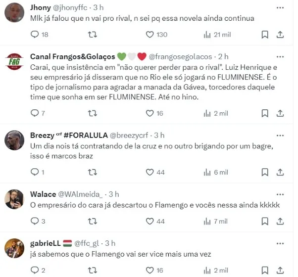 “Luiz Henrique só quer voltar ao Rio de Janeiro se for para jogar pelo Fluminense, seu time do coração”, escreveu na publicação desta terça-feira (26).