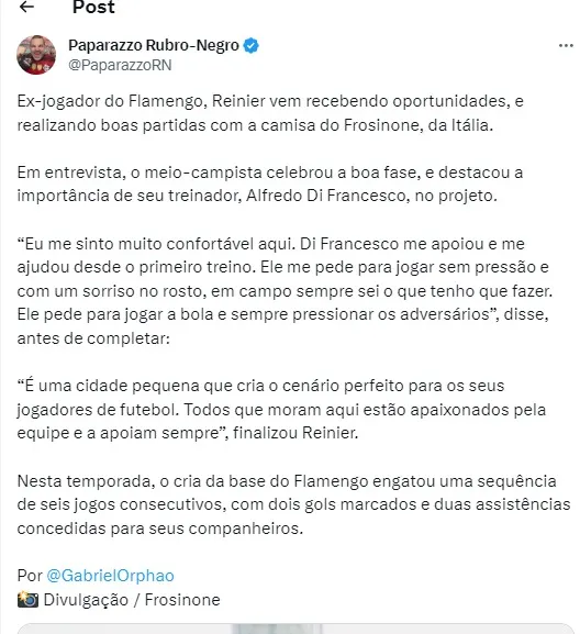 Cria das bases do Flamengo, o meia Reinier concedeu entrevista ao Paparazzo Rubro-Negro e falou da sua fase atual no futebol italiano. Ele celebrou a boa fase, e destacou a importância de seu treinador, Alfredo Di Francesco, do Frosinone, time da Itália.
