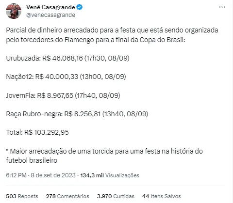 Em informação atualizada pelo jornalista Venê Casagrande às 18h12, a vaquinha para a final da Copa do Brasil se tornou a maior arrecadação de uma torcida para uma festa na história do futebol brasileiro, com mais de R$ 100 mil adquiridos até o momento. A notícia empolgou a Nação, que planeja fazer uma festa no Maracanã para o primeiro jogo da decisão. Além disso, os adeptos ficaram sabendo como a grana foi distribuída entre as organizadas.