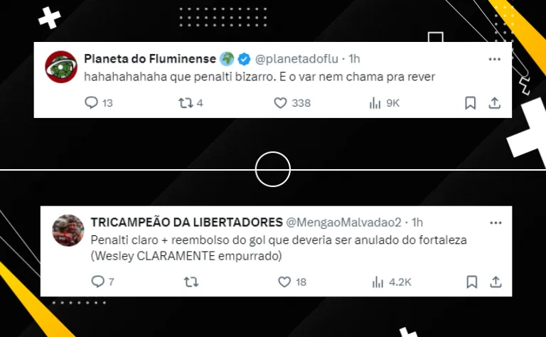 Alguns comentários foram favoráveis e outros contra, porém, um flamenguista indagou o pênalti marcado por Edna como um “reembolso”: “Penalti claro mais reembolso do gol que deveria ser anulado do fortaleza (Wesley claramente empurrado)”