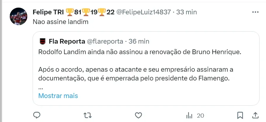 “Conversei com uma pessoa do estafe de Bruno Henrique e ela admitiu que até agora a renovação segue emperrada por causa do presidente. BH está em compasso de espera sem entender o porquê desse travamento”, disse Nicola.