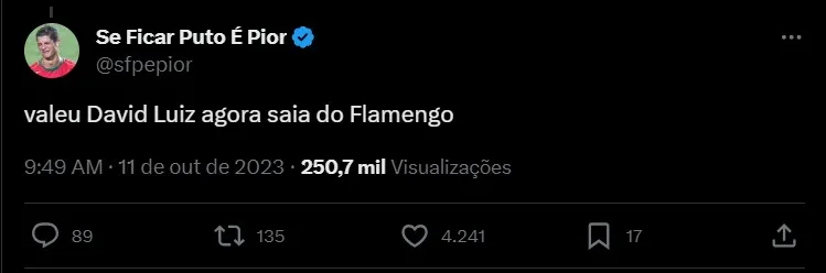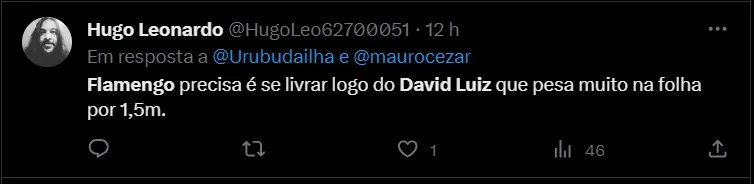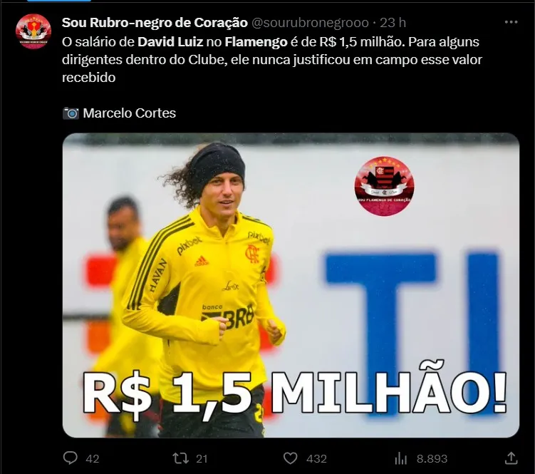 Com a possibilidade de deixar o Flamengo no final da temporada, com o futuro em aberto, o nome do jogador começou a ser especulado em outros clubes. Mas, dificilmente será o Corinthians, conforme informações do portal Lance. Apesar de ser torcedor da equipe paulista, o zagueiro chegou a ficar próximo de um acerto com o Timão, mas as tratativas acabaram não avançando. David Luiz tem contrato com o Flamengo até o fim de 2024, por conta da renovação automática que foi ativada no primeiro semestre.