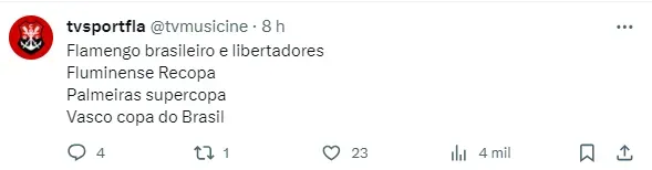 O perfil colocou times como Vasco, Palmeiras e Fluminense na mesma situação do Mais Querido. Além disso, acabou afirmando que um desses quatro times irá conquistar duas taças em 2024.