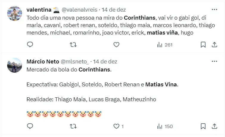 Com isso, alguns nomes começaram a ser especulados nos bastidores da equipe do Parque São Jorge. O mandatário já havia externado o desejo de contratar Gabigol, camisa 10 do Flamengo, mas outras posições também são prioridades para a equipe.