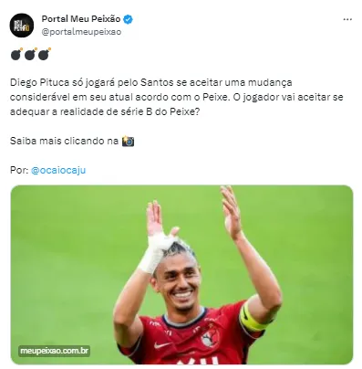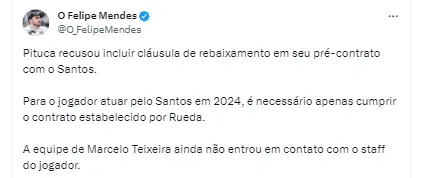 “Pituca recusou incluir cláusula de rebaixamento em seu pré-contrato com o Santos. Para o jogador atuar pelo Santos em 2024, é necessário apenas cumprir o contrato estabelecido por Rueda. A equipe de Marcelo Teixeira ainda não entrou em contato com o staff do jogador”, publicou.