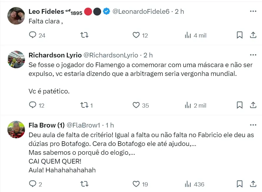 No X, os torcedores flamenguistas discordaram da opinião de André Rizek e acreditam que o time de Tite foi prejudicado, além de citarem falta de critério do juiz (veja comentários no fim da matéria).