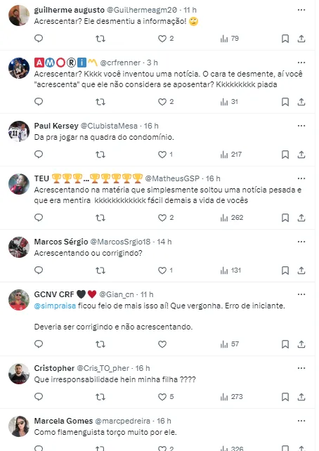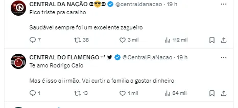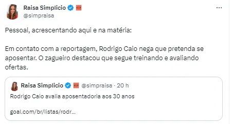 “Em contato com a reportagem, Rodrigo Caio nega que pretenda se aposentar. O zagueiro destacou que segue treinando e avaliando ofertas”, publicou a jornalista em suas redes sociais.