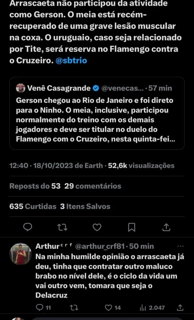 O jornalista também falou sobre Arrascaeta, segundo ele, é provável que o atleta diferentemente de Gerson fique no banco de reservas contra o Cruzeiro. Recém-recuperado de lesão, Arrascaeta não treinou normalmente, caso seja relacionado para a partida, é provável que fique no banco de reservas e possa ser acionado durante a partida.