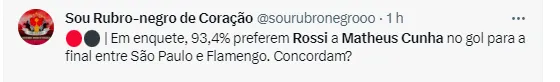 Matheus Cunha vem sendo muito criticado por torcedores do Flamengo e voltou a ser alvo de parte da Nação no jogo de ida da grande decisão da Copa do Brasil, contra o São Paulo. Isso porque a opinião foi que o goleiro falhou no gol anotado por Calleri. O argentino Agustín Rossi acabou sendo titular no jogo do meio de semana, contra o Goiás, e não foi vazado. Por isso, muitos então passaram a ficar na dúvida quem estará na meta do Mengão no jogo de volta contra os paulistas.