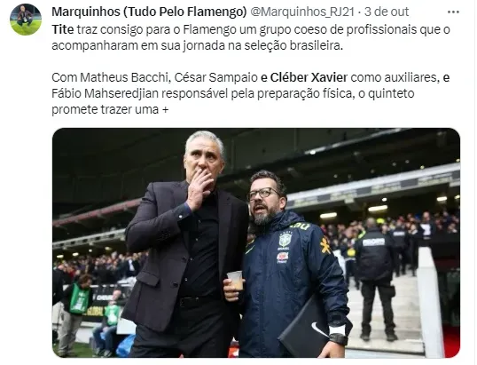 Segundo o Jornalista Eric Faria, por meio do GE, Tite já disse sim ao Flamengo e deve treinar o clube nas próximas semanas. Mas o treinador é conduzido por uma abrangente equipe da comissão técnica, que já o acompanha desde o Corinthians e também na Seleção Brasileira. Bora conhecer alguns desses nomes, que tem a expectativa de conduzir o Flamengo de volta às glórias.