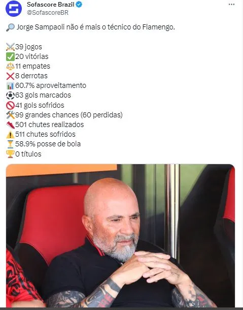 Na sequência, o desabafo: “Infelizmente, por inúmeros motivos anteriores à minha chegada e que tentei, mas não consegui mudar, não foi possível conquistar os resultados para colocar o Flamengo onde deveria estar. Lembrarei sempre do Maracanã lotado, pulsante. É o maior palco do futebol! Agradeço aos funcionários, jogadores, comissão técnica e os torcedores pelo convívio nestes 5 meses. Um abraço, Jorge Sampaoli.”, escreveu o ex-técnico do Mengão.