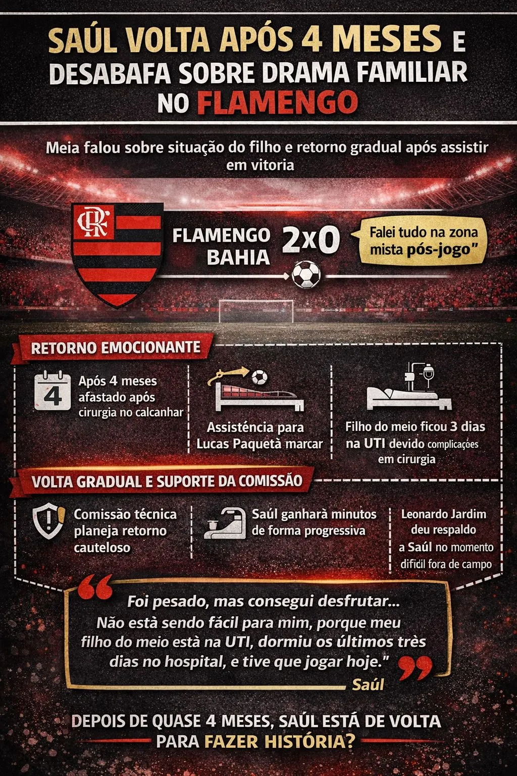 Com qualidade já comprovada, Saúl surge como mais uma opção forte para o elenco rubro-negro ao longo da temporada. O retorno, além de técnico, também carrega um peso emocional importante após semanas difíceis vividas pelo atleta.