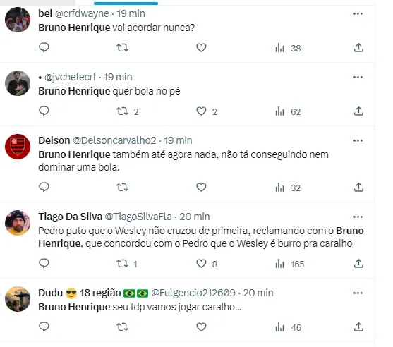 Outro opinou que o atacante não entrou em campo: “Se o Tite colocar o Bruno Henrique pra jogar, talvez dê bom pra gente”, reclamou. Um internauta citou que neste primeiro tempo faltou força de vontade pra ele: “Bruno Henrique tá na hora de começar a jogar já. No último jogo não jogou nada e neste está a mesma coisa. Só cai espera a bola no pé e quando chega não consegue dominar, tá complicado”, completou,