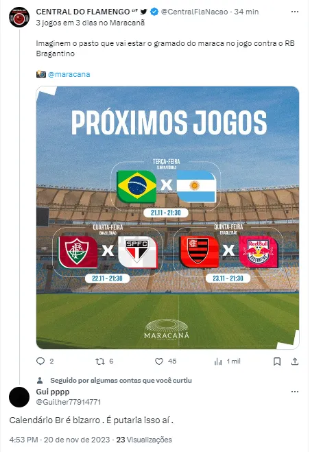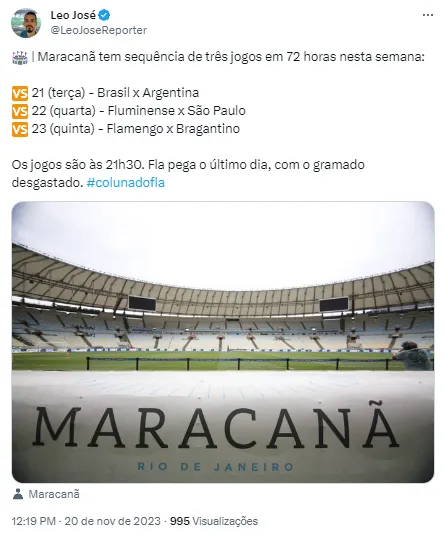 Com o calendário do estádio nesta semana, o Flamengo vai entrar no gramado do Maracanã no terceiro dia seguido de jogos no local. Isso porque a Seleção Brasileira enfrenta a Argentina nesta terça (21) e o Fluminense joga lá também na quarta (22).