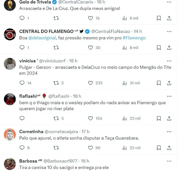 Eleito o melhor jogador do mundo pela Bola de Ouro, Lionel Messi o meia De La Cruz, que é alvo do Flamengo, afirmando que o atleta é um bom jogador, principalmente com espaço.
