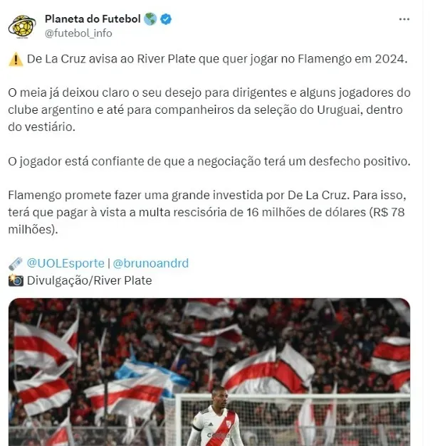 Nicolas de la Cruz tem contrato com o River até 2025. Os argentinos, que estão dificultando a situação do meia uruguaio, detém apenas 30% dos direitos do jogador, enquanto o Liverpool de Montevidéu tem 70%.