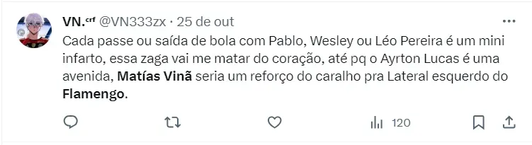 Destacando que a tendência em 2024 é que o Flamengo tenha uma nova lateral esquerda. “Se o Ayrton Lucas sair, como a tendência é a não renovação do contrato de Filipe Luiz, o Flamengo pode em 2024 ter uma dupla de laterais esquerdos nova. Formada por Matias Viña e Alex Sandro”, finalizou. O Flamengo enfrenta o Bragantino, nesta quinta (23).