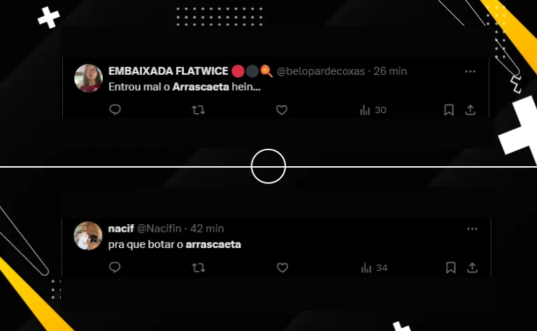 A torcida do Flamengo não entendeu a opção de Bielsa: “por qual razão Arrascaeta virou a 3ª opção na Seleção Uruguaia?”. “Se não for escalar o jogador, é melhor nem o convocar“, disse outro flamenguista durante a partida da Copa América.