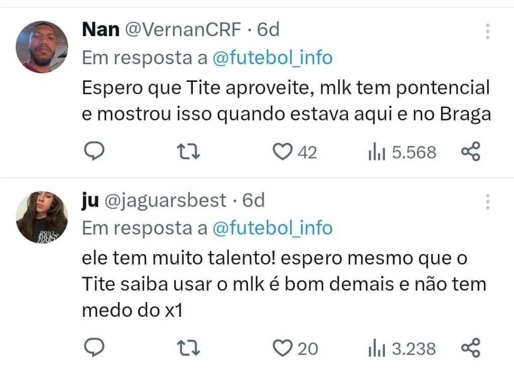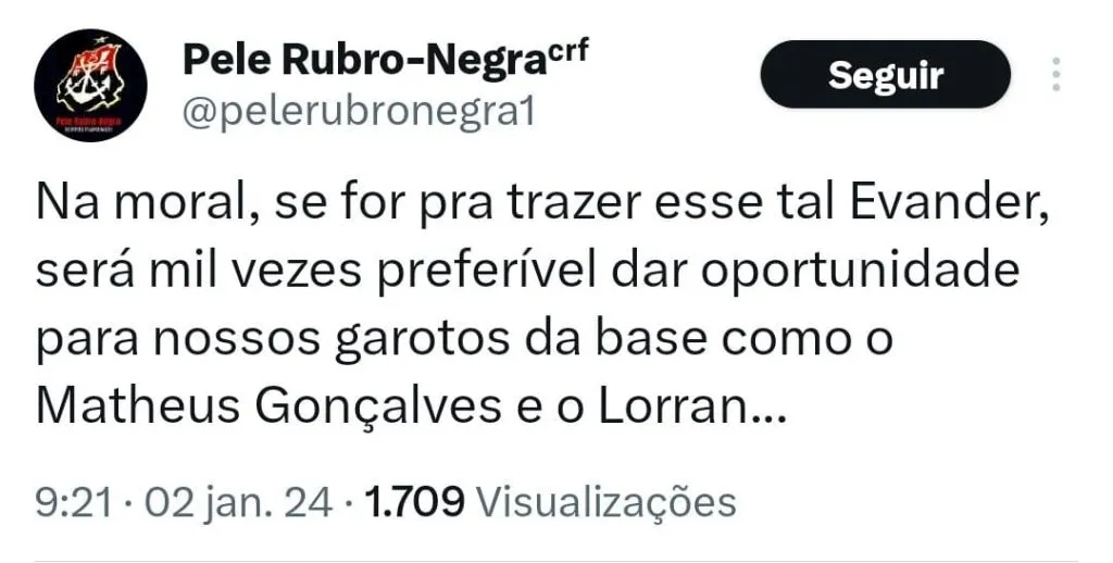 “Esse rapaz tem totais condições de exercer a função do Everton Ribeiro. É um jogador que sempre se destacou nas categorias inferiores, sempre observado por clubes de fora”, avaliou.