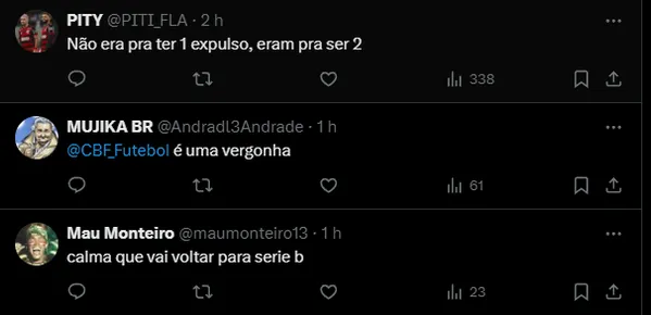 “A gente está fazendo um bom jogo. Estávamos, mas precisamos jogar contra o Flamengo e contra a arbitragem. O que ele está fazendo é vergonhoso. Parece que é o 1° jogo dele, está mais nervoso do que a gente“, falou o meio-campista antes de ir ao vestiário.