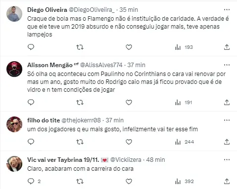 “O Rodrigo Caio hoje é praticamente carta fora do baralho do Flamengo. Quando o Tite tirou o David Luiz, eu até observei quem ele colocaria. Ele optou pelo Pablo. O Flamengo não tem o desejo de renovar com o Rodrigo Caio. O jogador recebeu na temporada proposta do Cruzeiro e do Coritiba, mas ele em nenhum momento quis sair. Ele quis cumprir o contrato dele. Beleza! O jogador tem esse direito, mas o Flamengo tem o direito de não utilizar ele”, informou Venê Casagrande.