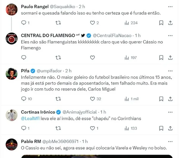 “O Flamengo tinha que ir atrás dele”, disparou Sormani. Para Quesada, Cássio chegaria na Gávea para colocar seu nome na história rubro-negra. Ele ainda disse que caso isso acontecesse, ele teria uma história como Júlio César e Raul.